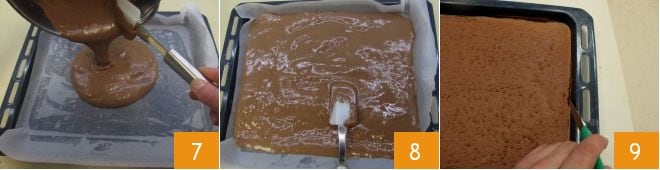 Butter and line a baking sheet with a sheet of parchment paper measuring 12x16 inches; pour the cocoa batter you made 7, spreading it evenly and smoothing it gently with a spatula 8: you should get a layer no higher than 1/4 inch. Bake in a preheated static oven at 392°F for 8-10 minutes (or at 356°F for 5-6 minutes if using a convection oven): the baking of the sponge cake should be short because it needs to stay quite soft. Once cooked, remove it and gently detach the edges that have stuck to the pan with a knife 9.
