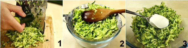 To prepare the zucchini crepe roll, start by washing, trimming, and grating the zucchini with a coarse grater 1; then squeeze them well using a strainer 2 and collect them in a bowl. Then add the Philadelphia cheese 3 and the bechamel sauce that you've prepared with the doses indicated above and following the procedure you can find Béchamel sauce