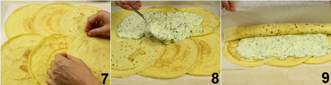 On a sheet of buttered parchment paper, arrange the crepes, slightly overlapping them to form a rectangle 7, spread the zucchini and Philadelphia mixture in the center of the rectangle 8, and roll the crepes up using the parchment paper as a guide 9
