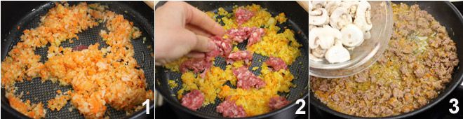 To prepare the polenta roll with sausage and mushrooms, start by peeling the carrot, garlic, and onion and then chop them together with the celery stalk: place the chopped mixture in a large pan in which you have heated 4-5 tablespoons of extra virgin olive oil 1. Let it simmer on low heat for about 15 minutes without letting it take on color, then add the crumbled sausage 2 and increase the heat a bit to brown the meat. Deglaze with a glass of white wine (at room temperature) and then add the ground pepper, the mushrooms 3 well cleaned and sliced not too thin, and let it cook for about 10-15 minutes over low heat, adjusting the salt. When the mushrooms are tender, add the tomato and cook for a few minutes until the sauce dries up, then adjust the salt if needed,