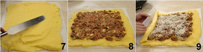pour the polenta onto a rectangle of parchment paper measuring 12 x 14 inches, spreading and leveling it well 7. Pour the sausage and mushroom mixture over the rectangle of polenta 8, leaving aside two tablespoons for the final decoration; distribute the mixture over the entire surface, leaving a free border of 1-1.5 inches all around, then sprinkle with 4 tablespoons of grated cheese 9.