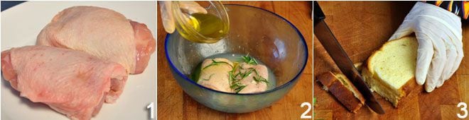 To prepare the rustic chicken in pan brioche crust, start with marinating the thighs 1. Simply mix all the marinade ingredients, immerse the thighs 2, cover with plastic wrap and leave in the fridge for an hour, turning occasionally. For the coating proceed by removing the edges and grating 4 the pan brioche (if desired, a food processor can be used) and add the rest of the ingredients.