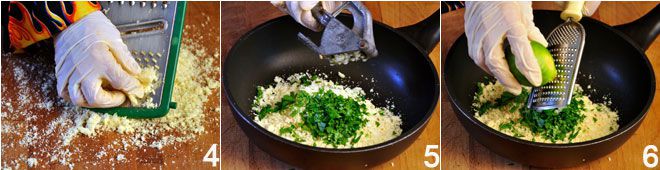 For the coating, it's important to differentiate based on the cooking method. If using a stovetop pan, toast the coating made of crumbled pan brioche, chopped parsley, crushed garlic 5, grated lime zest 6, and oil 7 in a pan and coat the chicken only after it's cooked.