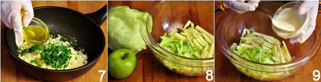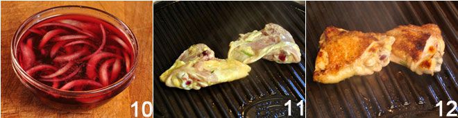 While the chicken is marinating in the fridge, prepare the salad. Cut the apples into matchsticks and the iceberg lettuce to the same size 8, add the dijonnaise sauce 9 prepared by dissolving the sugar in lime juice and then adding Dijon mustard, whole grain mustard, mayonnaise and mixing. Let it soak in the fridge. Add salt only at the end to prevent the lettuce from releasing too much water. Cut the purple onion and place it, stirring well with a little salt, in a container to marinate with vinegar and red wine 10. Twenty minutes will be sufficient.