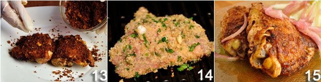 If the chicken was cooked on the stovetop, coat it 13 and plate it by adding the apple salad as a side dish, topping it with some strands of marinated onion. If using a classic barbecue, prepare the coating 'raw' 14 and apply it to the meat before grilling. This distinction is important not only for taste but also for function: the stovetop coating would tend to burn and produce a lot of smoke in the kitchen. Outdoors, this may be a minor issue.