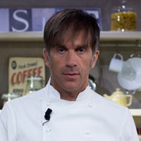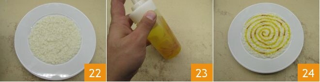 Now pour a ladle of rice onto the plate, tap the bottom of the plate with the palm of your hand so that the risotto spreads over the entire surface 22. Take the squeeze bottle with the saffron infusion, shake it 23, and draw a spiral on the surface of the risotto 24. Your Saffron and Milanese Rice D'O is ready to be enjoyed.