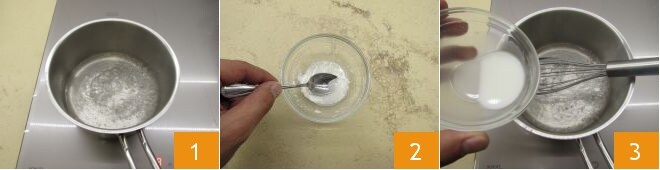 To prepare Saffron and Milanese Rice D'O, start with the saffron sauce. In a small saucepan, pour the water and bring it to a boil 1. Meanwhile, in a small bowl, dilute the cornstarch in 15 g of cold water 2 and as soon as the water starts boiling, add it very slowly to the saucepan, always stirring with a whisk 3.