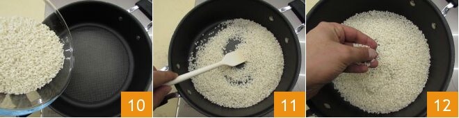 Set the saffron sauce aside and proceed to cook the rice. First, put some water in a saucepan and bring it to a boil; it will be needed for cooking the rice. Initially, you'll need to toast it dry, by pouring it into an already hot pot 10. In this phase, it is essential to stir the rice 11 and often touch it with your fingers to determine when it is sufficiently hot 12. Perfectly toasting the rice allows the main ingredient of this dish to express itself in the best way.