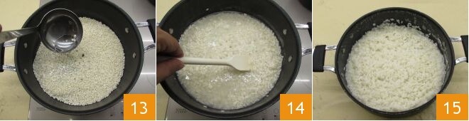 Only when it is perfectly toasted, proceed to cook the risotto: wet it with 2-3 ladles of unsalted boiling water 13, stir, and lower the flame. Continue cooking the rice very gently, for about 16 minutes, adding more water as needed and stirring just occasionally 14, gently, to keep the grain intact. Always taste the rice to determine when it reaches the perfect point of cooking and as soon as it is ready, cooked but still al dente 15, remove the pot from the heat and wait about 30 seconds; it is important that the saucepan is not hot during the creaming phase.