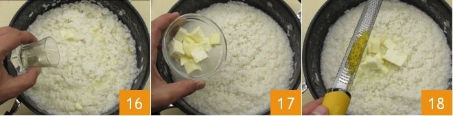 At this point, add the vinegar 16, which will help to further highlight the cereal aroma and contrast the starchy part of the rice, the butter 17, and the grated lemon zest 18, being careful not to take the white part.