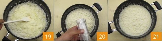 Add the Grana cheese and stir 19. Once the rice is well creamed, add a splash of water to achieve the right creaminess and add salt only at the end 20. Stir once more 21 to help it dissolve. Given the use of Grana cheese, it is best to add salt only at the end and always taste to avoid over-salting.