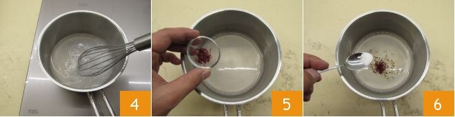 Let it simmer for a few seconds 4, then remove it from the heat and let it cool for a few seconds. The sauce should be silky and smooth. At this point, add the saffron threads 5, a pinch of sugar 6, and salt.