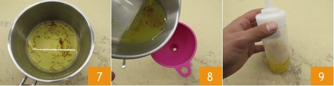 To enhance the release of the essences contained in the saffron and not disturb the shape of the threads, do not stir with the whisk but gently move the saucepan 7. Doing this away from the heat, at a temperature around 158°F, the saffron will fully release its aroma. So as soon as you reach a temperature of about 122°F, transfer the sauce into a squeeze bottle (8-9); in this way, the saffron will continue to release colors and aromas.