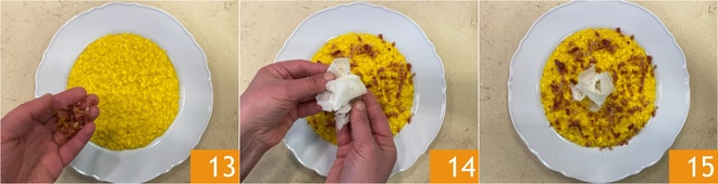 Plate and complete with the crispy pancetta 13, then garnish with a few petals of raspadura cheese 14. Your saffron risotto with taleggio and pancetta is ready to be served 15!