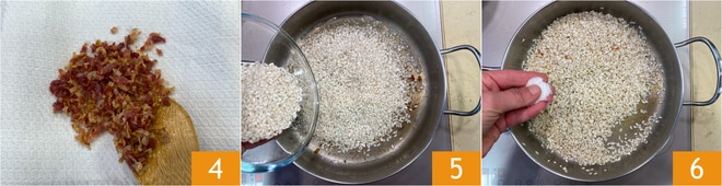 Transfer the crispy pancetta onto absorbent paper 4 and set aside. In the same saucepan, pour the rice 5, add the salt 6, and toast for a few minutes until the grains are warm to the touch.
