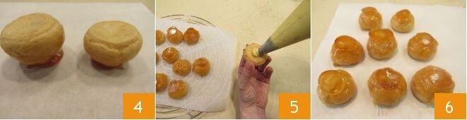 Now, focus on filling and glazing your Choux pastry (pâte à choux). First, make the caramel: put the water and sugar 1 in a saucepan, let it boil until the syrup transforms into a Caramel 2. Quickly dip one cream puff at a time into the freshly made caramel 3 (be very careful not to touch the caramel, as it will be hot).
