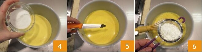 Mix with a whisk and add the sugar 4, the seeds from a vanilla bean 5 (first cut it in half and then scrape the seeds with the blade of a thin, sharp knife), and the sifted cornstarch 6.