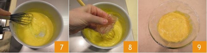 mixing with a whisk 7, and add a pinch of salt. Sift together the cornstarch and flour 8, adding the powders to the egg and sugar mixture with a spatula, gently and without deflating the mixture 9.