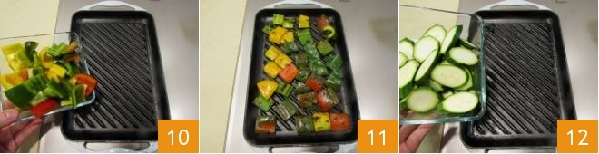 When the grill is hot, cook the vegetables a little at a time: place the diced peppers side by side 10, grilling them for 5 minutes and turning them with kitchen tongs for even cooking 11, then place the zucchini rounds on the grill 12