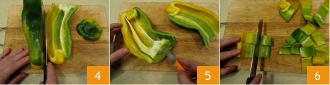 take the peppers, remove the top part, cut them in half 4, then use a knife to remove the white filaments and seeds inside 5. Cut them into slices, then into rather large cubes and set aside 6.