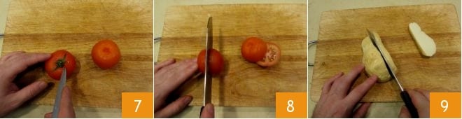 Remove the stem from the tomatoes 7 and slice them into rounds also about 1/4 inch thick 8. Take the scamorza and slice it lengthwise 9, then heat a grill on the stove.