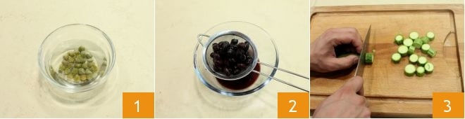 Add 1 tsp of capers 13, 1 tbsp of black olives, dill 14, and 1/4 of the eggplants cut into chunks 15; season with salt and pepper to your liking.
