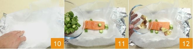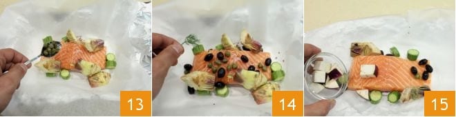 At this point, you can prepare the papillote: in a high-sided baking dish, lay down a piece of aluminum foil at least 12 inches long and on top of it a slightly shorter piece of parchment paper 10. Place a salmon fillet and 1/2 cup of zucchinis on it 11; drain the artichokes cut into cubes from the acidulated water and add 1/4 12.