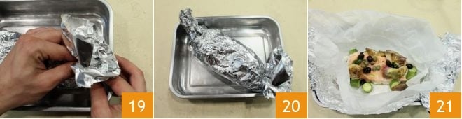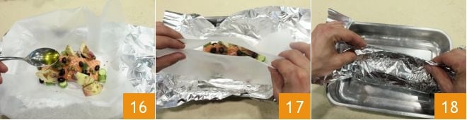 Finish by pouring a teaspoon of oil and then close the papillote 16, first joining the edges of the parchment paper 17 and then sealing the aluminum well 18.