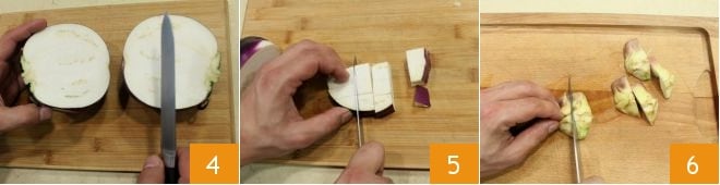 Cut the eggplant in half 4, then into slices, and then reduce it into 0.4 inch cubes 5. How to clean artichokes, remove the tips, cut them in half, and then into 4 wedges 6;