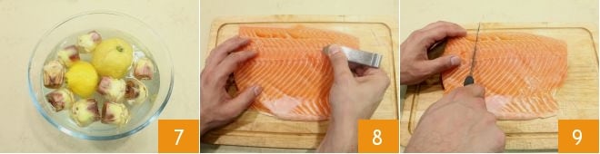 as you cut the artichokes, put them to soak in a bowl with water and lemon and set aside 7. Take the salmon, run your fingertip along the flesh to check for any remaining bones and remove them with the help of kitchen tweezers if necessary 8; then with a knife, divide it into 4 fillets weighing 7.6 oz each 9.