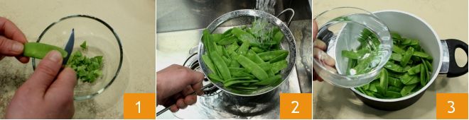 To prepare the salmon fritters with thyme and snow peas, start by preparing the snow peas: trim both ends with a small knife 1, then rinse them under running water 2 and place them in a large saucepan: fill it with water 3 until the snow peas are covered.