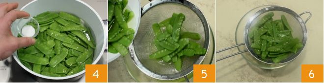 Then add salt 4 and bring to a boil. It will take about 10 minutes for the snow peas to soften but not disintegrate. Then drain them 5 and leave them in the colander to cool and drain the cooking water 6.