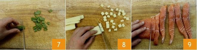 When they are cool, cut them into small squares 7. Then cut the provolone into cubes 8; remove any bones from the salmon fillet using tweezers, then cut it into strips about 0.4 inches thick 9 and reduce them to cubes. Set all these preparations aside.
