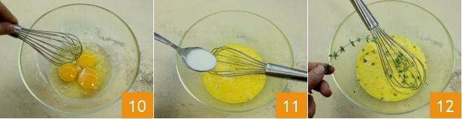 Now start whisking the eggs with a whisk 19, then add the pepper, salt to taste, and 2 tablespoons of room temperature milk 11. Also add the thyme leaves and mix 12.