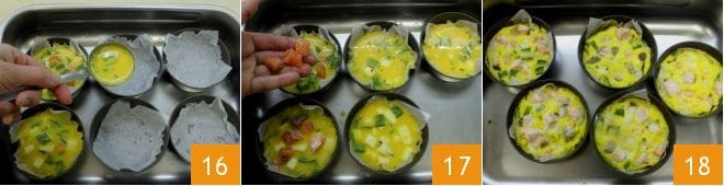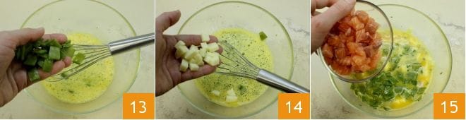 Add the snow peas 13, the provolone cubes 14, and the salmon cubes, leaving 1/3 aside to add before baking the fritters 15. Mix everything to combine the ingredients.