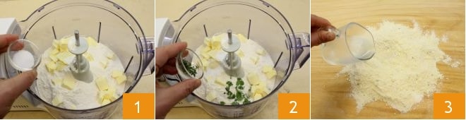 To prepare the salmon quiche with potatoes and radicchio, first prepare the Easy Shortcrust Pastry: in a food processor with blades, place the sifted flour, cold butter cut into cubes, and salt 1. Add thyme and oregano leaves 2, then blend until you get a sandy mixture; place the mixture on a work surface, create a well in the center, and then pour in the ice-cold water gradually 3.