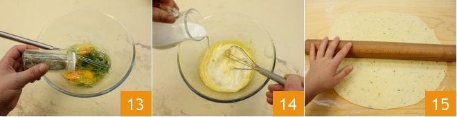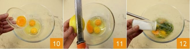 In a separate bowl, pour the whole eggs and the yolk 10; add the grated lemon zest 11, dill, keeping a few leaves aside, and salt 12.