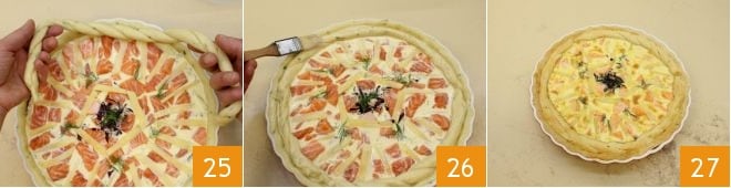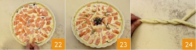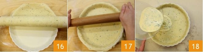 Butter and flour an 11-inch diameter pie pan; roll the brisè pastry around the rolling pin and lay it over the pie pan 16, making it adhere well to the bottom and sides. Press with the rolling pin to remove the excess pastry 17, keeping it for the final decoration. Prick the base of the brisè pastry with a fork and then pour in the egg and cream mixture, reserving a small amount to brush the quiche before baking 18.