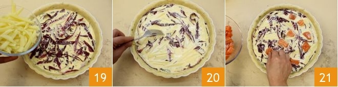 At this point, fill with the radicchio and potatoes you have previously cut 19, reserving some of both vegetables for the final decoration. Distribute the filling evenly with a fork, covering the vegetables with the egg-based filling 20; also add the salmon chunks, placing them gently over the entire surface of the pie 21.