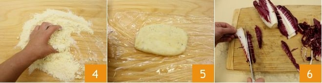 Knead the sandy mixture by hand for at most 5 minutes 4 until you obtain a homogeneous dough; make a loaf and then wrap it in plastic wrap 5, letting it rest in the refrigerator for at least 30 minutes. In the meantime, take care of the vegetables and fish: wash the radicchio and potatoes with plenty of fresh running water; remove the hard core of the radicchio and then cut it into strips 6.