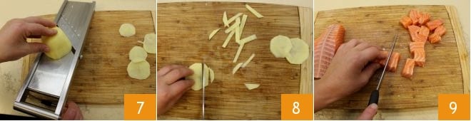Peel the potatoes and slice them with a smooth bladed mandolin 7, cut them into strips 8, and then set them aside in a bowl full of water. Take the salmon, remove any bones with kitchen tweezers, and then cut it into fairly large chunks 9.