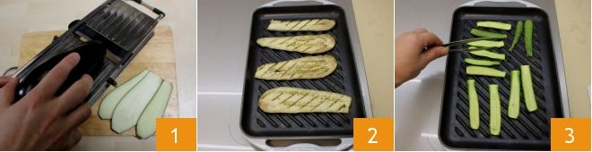 To prepare the salmon rolls with grilled vegetables and cheese, start with the vegetables: use a mandoline to thinly slice the washed and trimmed eggplants 1, then do the same with the zucchinis. Then heat a cast iron grill or a non-stick pan and grill the vegetables (2-3) on both sides for a few minutes.