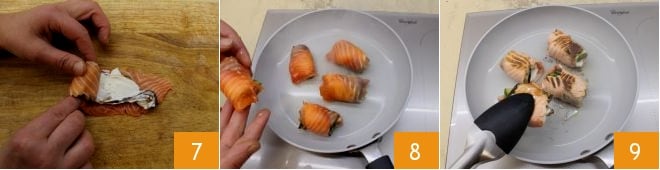 then continue with the robiola, then roll up the slice of salmon 7. Continue this way until all the ingredients are used up. Heat a non-stick pan and briefly sear the salmon rolls 8 turning them to cook on all sides 9.