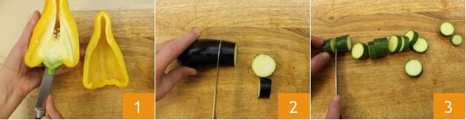 To make the shish kebabs, wash all the vegetables and dry them, cut the bell pepper in half 1, remove the stem, seeds, and inner filaments, then cut each half lengthwise in two. Trim the eggplant and cut it into slices 2, do the same with the zucchini 3,