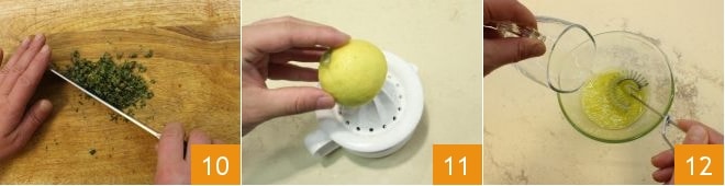 Set aside the vegetables in separate bowls; they will be used to compose the shish kebabs. Drain the capers, dry them, and then chop them together with the aromatic herbs 10, squeeze the lemon juice 11 and strain it, in a small bowl emulsify the olive oil and lemon juice 12