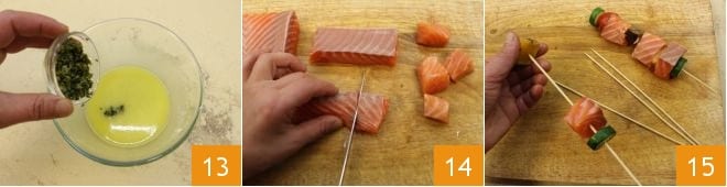 add the chopped herbs and capers 13, set aside the marinade obtained and focus on the salmon. Remove any bones from the fillet with a special tweezer, then cut the salmon into 3/4 inch x 3/4 inch cubes 14, take a wooden skewer and assemble the skewers alternating a salmon cube (for a total of 4 cubes per skewer) with the various grilled vegetable bites 15.