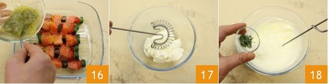 Place the shish kebabs in a baking dish and flavor them with the marinade 16, cover with plastic wrap and place in the refrigerator to marinate for 30 minutes. Meanwhile, prepare the accompanying sauce: in a small bowl, pour the yogurt and soften it by mixing with a whisk 17, flavor it with a pinch of salt and fresh thyme leaves 18,