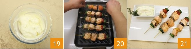 mix to blend and flavor the sauce 19 and store in the refrigerator until ready to serve. Now proceed with the cooking, heat a cast iron grill, the heat should be very high, and place the skewers 20, cook them on all four sides, a few seconds per side. Once cooked, serve the salmon and vegetable shish kebabs hot, accompanied by the sauce 21.
