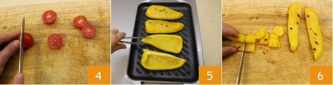 halve the cherry tomatoes 4 and proceed to cooking. Place a cast iron grill on the stove, heat it up, and grill all the vegetables by placing the bell peppers and cooking them on both sides 5 for less than 1 minute, or just enough time to create the typical grill marks. After cooking, dice the bell pepper 6 and set aside.