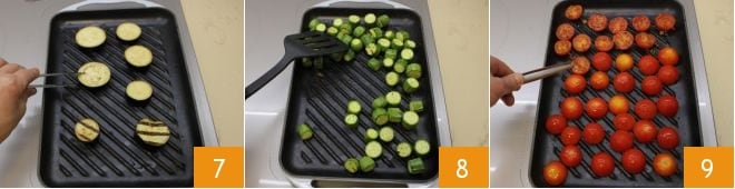 Continue grilling the eggplants 7, zucchinis 8, and tomatoes 9 in the same way.